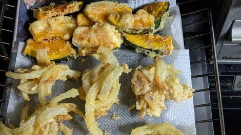 トレーにのっているのは、玉ねぎの天ぷらとカボチャの天ぷらですね~