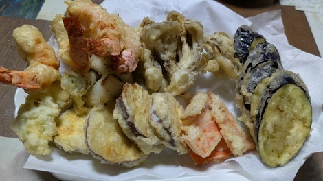 今日の晩ごはんは、「天ぷらの盛合せ」ですか~🍤🍆🥕🍠