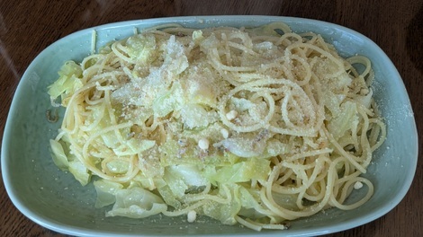 キャベツと粉チーズがたっぷりのスパゲッティですね~