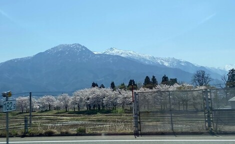 今日の桜の向こうに白い峰々が…、この写真は佐渡の写真ですか?