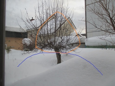 サンルームの外の雪ここまで雪が積もってます。戸が開きません窓越しに姫リンゴ青い線の辺りまで雪山を作ってオレンジ色の線くらいまで 枝を掃ってやりたい。そうしたら 春に姫リンゴは お姫様みたいにお嫁さんみたいに 綺麗に咲くのよ。