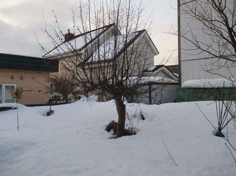 こちら雪が大分解けてきて 姫リンゴの木の下は