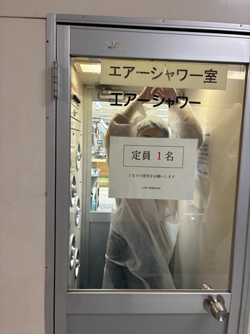 白衣・帽子・専用の靴を身につけたうえで、エアーシャワー室でホコリやゴミを吹き飛ばしてから工場内へ。