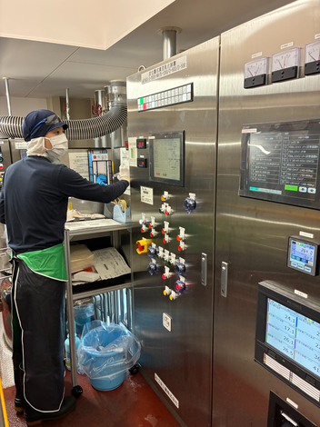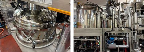 この部署では、原料を「溶解槽」で溶かし、「真空乳化機」で熱水と混ぜて乳化させます。