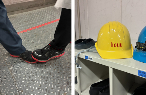 ホーユーの工場では、部署によってヘルメットの着用や、安全仕様の靴を履く必要があります。