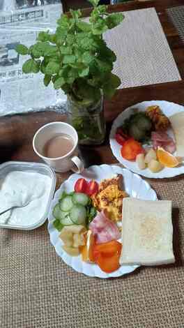 朝は、パンにコーヒー、サラダ、卵焼き等が定番です。ヨーグルトとハーブもいただきます。