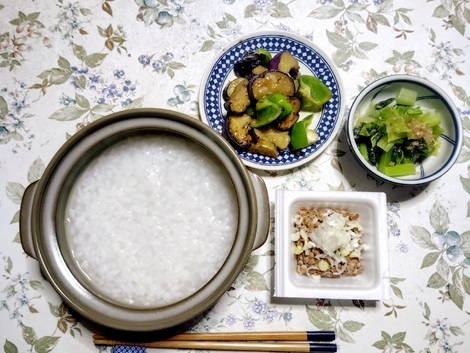 粥、納豆、ナスとピーマンの味噌炒め、茹で小松菜