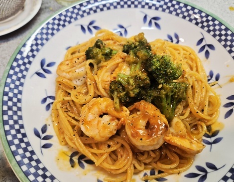自分のだけだったので、冷凍してあるエビ&ブロッコリを使って、包丁もまな板も使わないで😅💦アンチョビとアメリケーヌで時短?で作ったのですが、なんだかとってもおいしくできたので元気モリモリです🙌🐭🎈