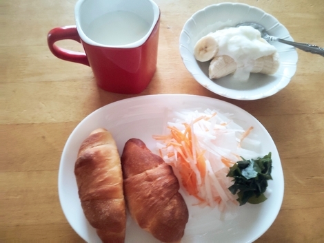 塩パン、大根サラダ、バナナヨーグルト、ホットミルク