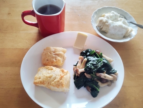 スコーン、ほうれん草としめじの炒め物、チーズ、バナナヨーグルト、紅茶
