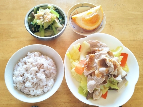 雑穀米、ゆで豚サラダ、ゆで小松菜、いよかん