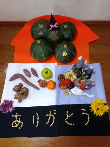 ハロウィンのかぼちゃで、収穫パーティー開催。黄菊、かきのもとも参加出来ました。ネズミさん……畑の野菜、庭の果実ありがとうね。又ね