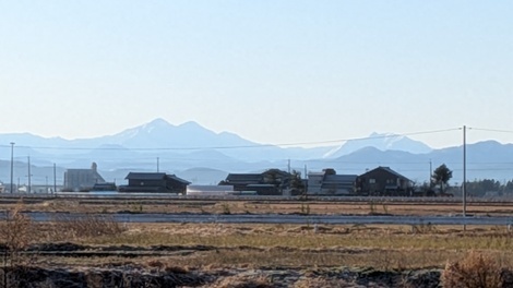 朝、8時、南東の方角に越後三山がくっきりと見えた(燕市米納津の自宅から)。