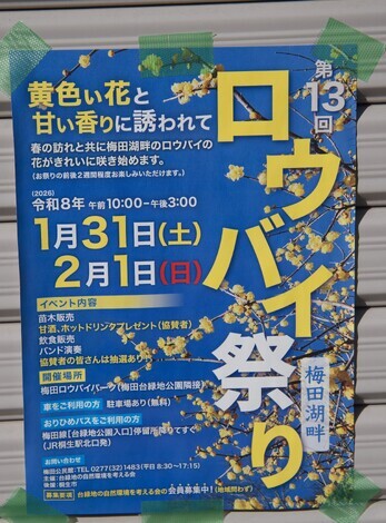 桐生の梅田湖畔にあるロウバイパークに行ってきました。さすがにまだ早かったですが、1月31日と2月1日にイベントがあるそうです。
