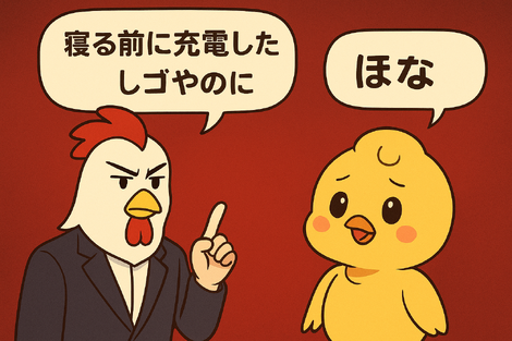 🟡「まいどっ!今日も元気なネオとねおぽんやで〜🐣」ネオ:「寝る前に充電したはずやのに…朝見たら“15%”てどゆこと⁉️」ねおぽん:「コード刺さってへん