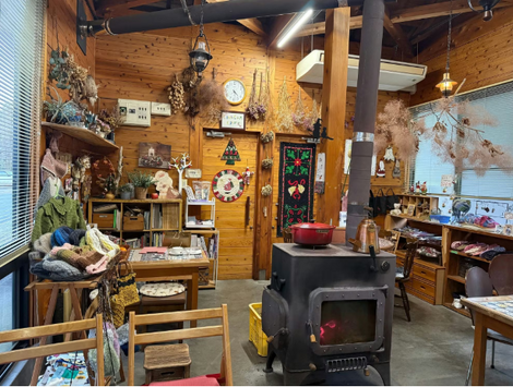 冬には、揺らめく火に癒される暖炉があり、店主が手がけた作品や地元の方々が手作りした素敵な小物が飾られ、お店のいたるところから手作りの優しさが伝わってきます。