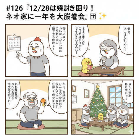 ネオ:「みんな、今年も残すところあとわずかやで!今日は、ご近所への年末の挨拶回りと、今年のネオ家の大反省会や!」
