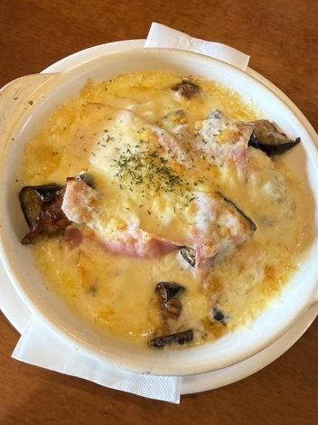 こちらは、熱々で運ばれてくるチーズたっぷりの『ナスとベーコンのドリア』
