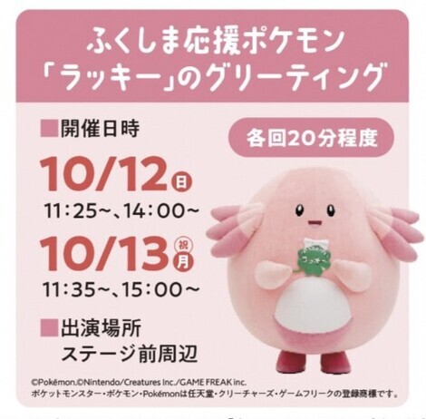 福島県ゆかりのゲストによるトークステージやライブパフォーマンス、ふくしま応援ポケモン「ラッキー」のグリーティングなどイベント盛りだくさんです✨