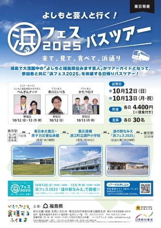 また、福島で活動する「よしもと福島県住みます芸人」がツアーガイドとなって、参加者とともに『浜フェス2025』を体感する東京駅発着日帰りバスツアーも催行します!