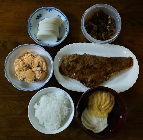 ステーキ、鮭缶、かまぼこなどを食べました