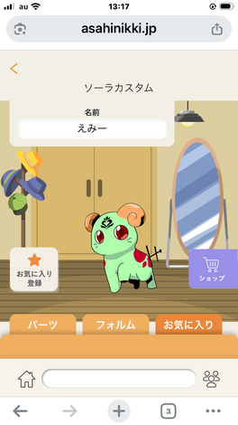 アプリ内でご自身のアバター「ソーラ」がつくれます。朝散歩をしたり日記投稿をするとアプリ内通貨「ジェム」が貯まります。「ジェム」を使って「ソーラ」のパーツをゲットしたり、「ソーラ」をお好みにカスタマイズして楽しむこともできます。