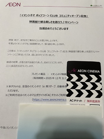 当選しました🎊応募したことを、すっかり忘れてました😅9月はイオンシネマで、4回映画を観ました。来月以降も、観たい映画がたくさんあるので、とても嬉しいです🥳何の映画に使おうか、ワクワクします💗どうもありがとうございました🎫