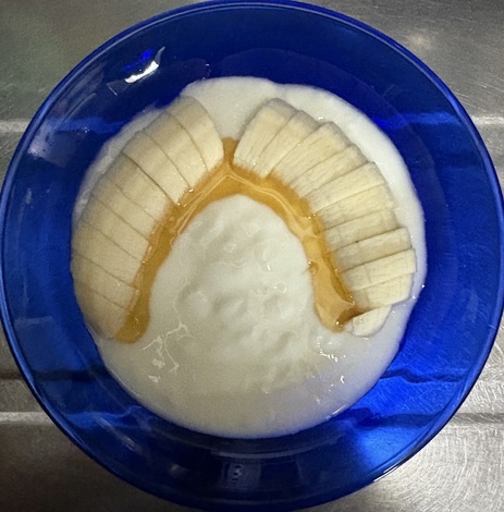 毎日の日課、バナナ入りヨーグルトに、ハチミツをかけて食べました。