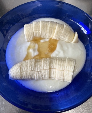 毎日の日課、バナナ入りヨーグルトに、ハチミツをかけて食べまし