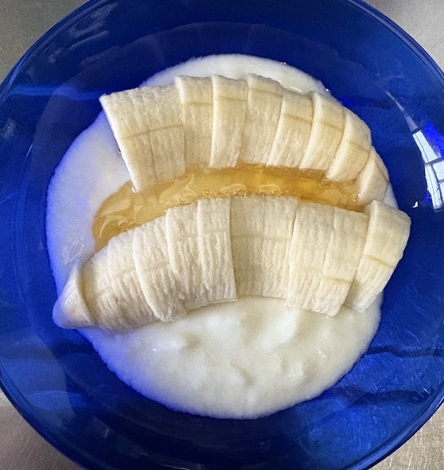 毎日の日課、バナナ入りヨーグルトに、ハチミツをかけて食べました。