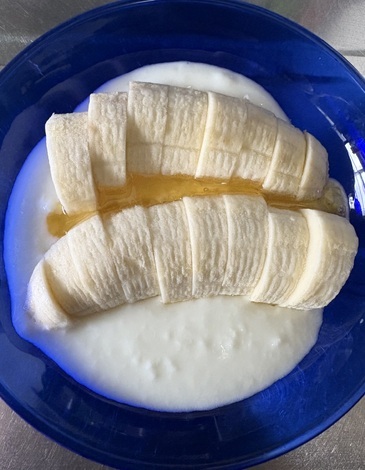 毎日の日課、バナナ入りヨーグルトに、ハチミツをかけて食べました。