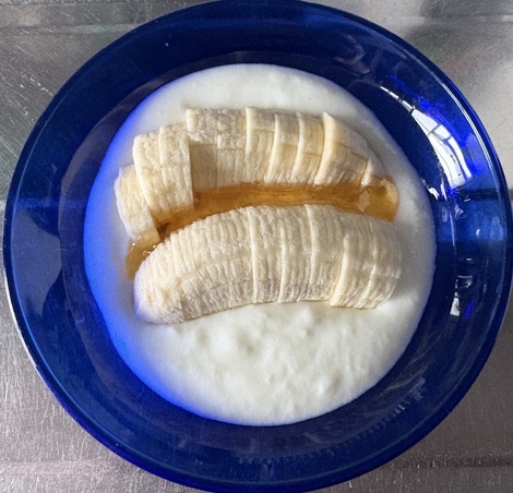 毎日の日課、バナナ入りヨーグルトに、ハチミツをかけて食べました。