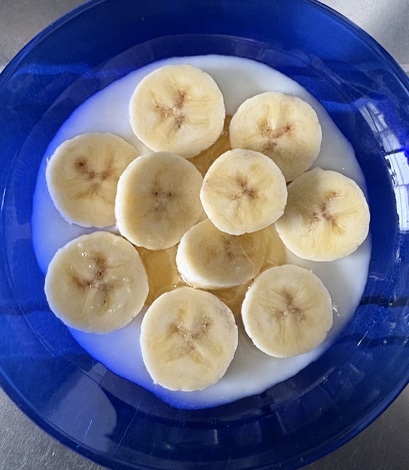 毎日の日課、バナナ入りヨーグルトに、ハチミツをかけて食べました。