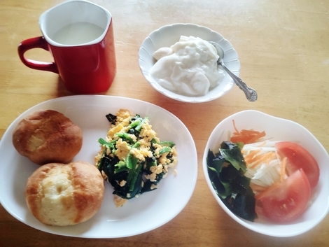 パン、ほうれん草と卵の炒め物、大根サラダ、バナナヨーグルト、ホットミルク