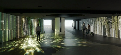 空港という“出会いと旅立ちの場所”を象徴する作品で、水の流れや空の広がりを表現しています。