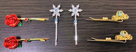 『美女と野獣』の赤い薔薇と、『アナと雪の女王』の雪の結晶と、『シンデレラ』のカボチャの馬車をモチーフにした、ヘアピンです🌹❄️🎃