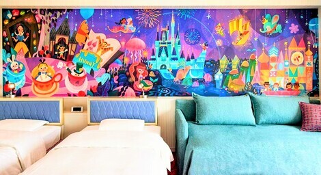 プーさんに特化したキャラクタールームは、ディズニーホテルの中にないのですが、セレブレーションホテルの“ウィッシュ”スタンダードルームの壁には、アリスやピノキオやアラジンやアリエルに囲まれて、青い風船を持ったプーさんが描かれていますよ!🎈🧸