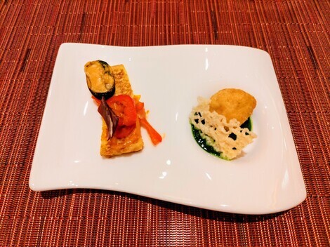 こちらは前菜の、「鱈のブランダード 春菊とパルメザン ハモン・イベリコとムール貝のライトフレンチトースト」です。