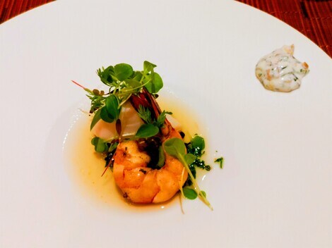 “ディズニー・クリスマス”スペシャルディナーのお魚料理、「黒ムツのスチームとスパイシーシュリンプのオーブン焼き ほうれん草のディップ ワイルドライスと香味野菜のブロス」です。
