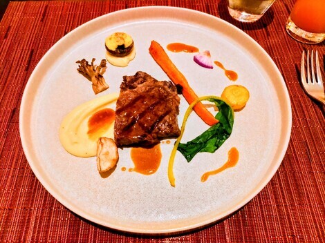 “ディズニー・クリスマス”スペシャルディナーのメイン、「国産牛サーロインのグリル スタッフドマッシュルームと根菜のロースト カルダモンを効かせたグレイヴィーソース」です。