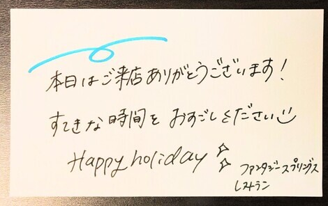 「ファンタジースプリングス・レストラン」でお食事をして、いつものアンケートを頂いたのですが、なんと裏面が、手描きのメッセージでした…!!✒️📋️