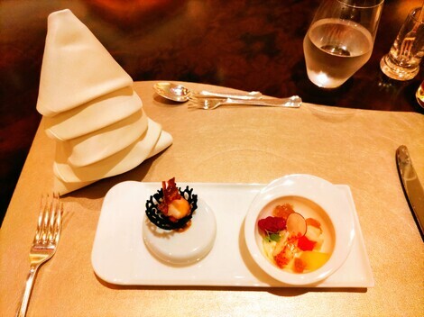 「カリフラワーピュレ ロブスターとカラスミ」と、「真蛸とチョリソーのタルトレット」です🐙🥦