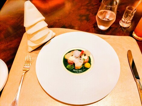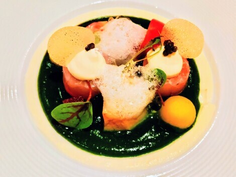 エンパイア・グリル「“ディズニー・クリスマス”エメラルド」の冷たい前菜、「金目鯛のマリネと生ハムのロール仕立て 軽くスモークした帆立貝とキャヴィア 柑橘類のフォーム」です。