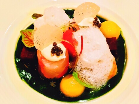 再びエメラルドの冷たい前菜、「金目鯛のマリネと生ハムのロール仕立て 軽くスモークした帆立貝とキャヴィア 柑橘類のフォーム」です。
