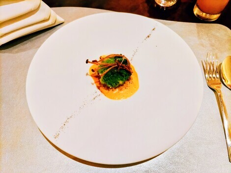 再びエメラルドのお魚料理、「チリメンキャベツで包んだ平目と渡り蟹のスチーム ホッキ貝とクリュスタッセのスパイシーリゾット(アメリカ産米)」です。