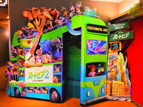 シネマイクスピアリ「ズートピアシアター」入口手前には、オープントップバスを運転するニックと、乗客御一行様がいらっしゃいます(笑)🚌