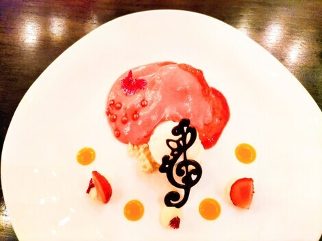 「ディズニーストーリービヨンド」スペシャルメニューの「ストロベリーのティラミス風、マスカルポーネアイスクリーム添え」、完成した状態です🧀🍨
