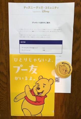 ディズニートーク★キャンペーンに当選してプーさんグッズをいただきましたオリジナル缶バッジとクリアファイルのセットですどちらも可愛らしくて嬉しいプレゼン