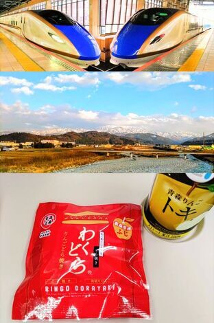 先ほど「かがやき」からまた立山連峰が見えました。車内販売では“青森県・函館フェア”ということで、青森県産ふじを使用したリンゴのどらやき「わくどら」を購入することができました🍎