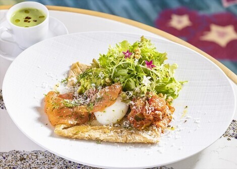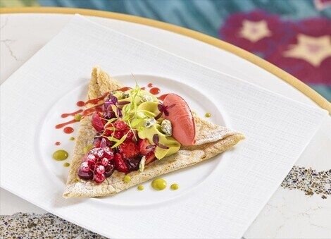 お食事系が「スモークサーモンとラタトゥイユのガレット 半熟卵添え」、デザート系が「ガレット・オ・フリュイ・ルージュ ピスタチオクリームと苺ソルベをのせて」です🍓♪